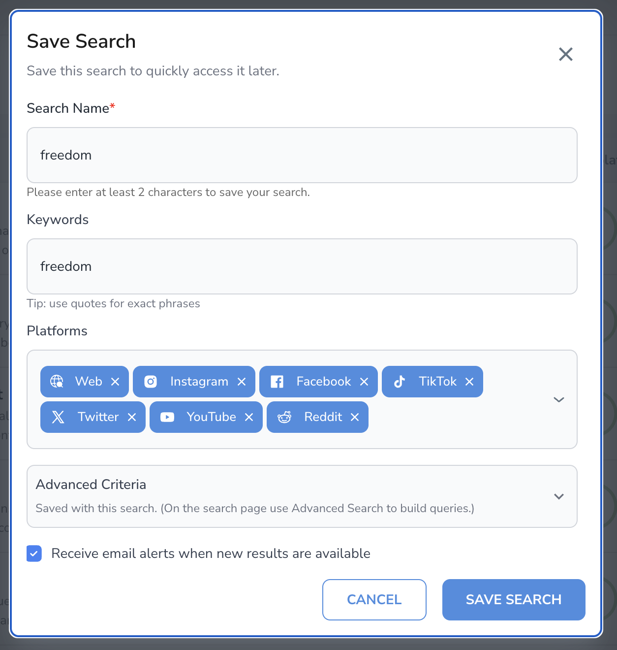 - Separate searches by topic — for instance, one for competitors, another for campaign performance, and another for risk terms.