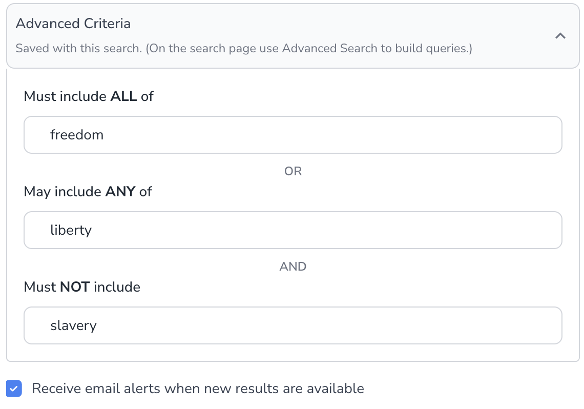 - Build complex keyword logic using must include, may include, and must not include fields.